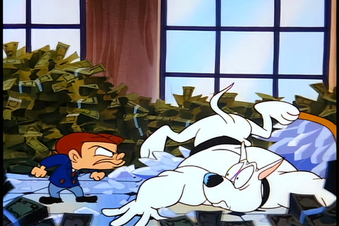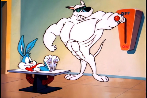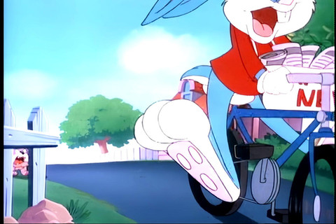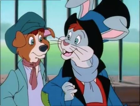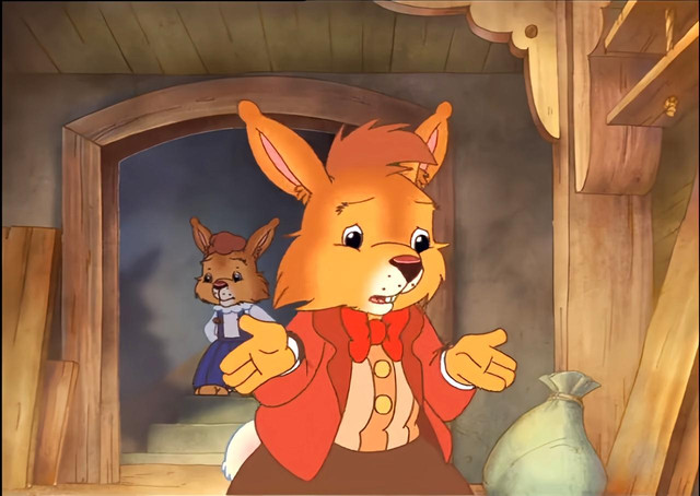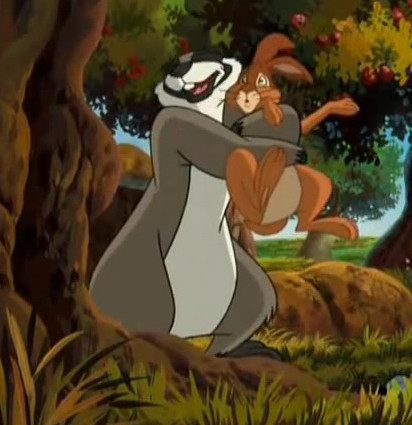 Brer Rabbit is hanging from a tree from a snare trap set by Brer Fox.