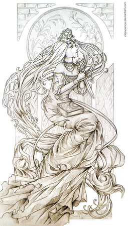This is beautiful! I love the way the hair flows from being the "real" way to a design--I don't know how to explain that. But it looks really neat. Everything is so graceful in this picture-it's gorgeous! ^^ The difference between foreground and background is really pretty as well. You're very, very talented!!