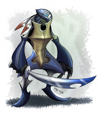 Interesting little bugger. I wouldn't want to be hit with that sword >__> I like how his face is a mask, though, its creative.