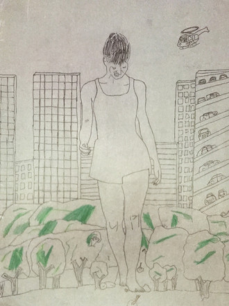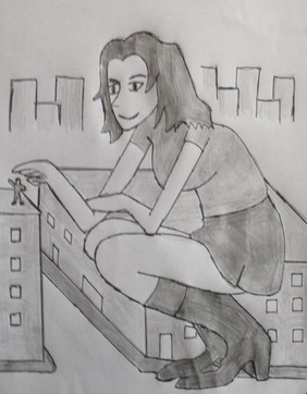 A sitting giantess is leaning her back on a clock towerRelated content