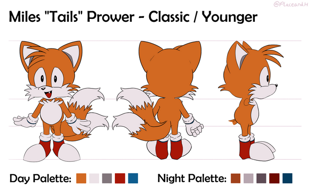 An alternate version of the modern Tails model sheet .Classic Tails features a new head, chest, cuffs, and darker fur. He had much shorter proportions in SatAM, which made it awkward to reuse the aforementioned model sheet. This is a bit closer to how Tails appeared in early Archie issues, and Spaz's covers were good reference art.