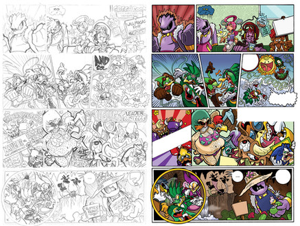 Blacks and background colours now. These steps involve the use of clipping masks, so you should familiarize yourself with how they work. You'll be using them a lot when you colour the characters.<<<=== PREV PAGE NEXT PAGE ===>>>