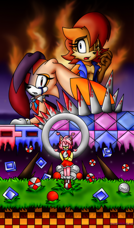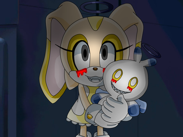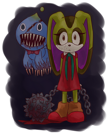 Aaaaand here we have a painting of Cream the Rabbit and the Tails Doll mutation from Sonic #247. You know, I used to think that Titan Tails from Sonic #150 was the creepiest design Archie ever came up with, but this... thing... is a strong contender for the title. I just hope Cream has got plenty of lives left.So what do you think about Archie's take on the Tails Doll? Is it an imaginative elaboration of a Sonic trope, or did Archie take its creepiness just a liiiiiiittle too far?