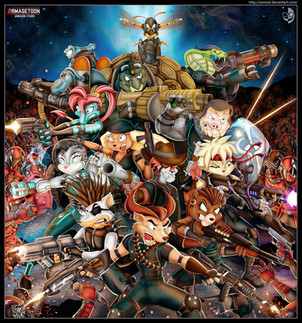 This commission belongs to as another entry in my "Fight For Freedom" series! In a one-night-only special event at the New Mobotroplis Coliseum, we have the climactic battle at the end of the Iron Dominion's invasion in Sonic #211! Aqua-Angel170 wanted Geoffrey St. John and Bride of the Conquering Storm facing off in the foreground, with other heroes fighting for freedom in the background. Huge battles like this are tough to paint, but very rewarding in the end. And now... llllllllllllet's get ready to rumbllllllllllle!!!YOU CAN WATCH A PLAYBACK OF THIS PAINTING HERE .