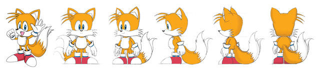 More work for REGIT-NOSMIRC-RANUL . There are going to be a lot more of these, let me tell you.This is actually my second attempt at drawing Tails in his current appearance. I started with a Segafied style that didn't turn out so well, so I looked towards Tracy Yardley, who draws Tails with slightly different ears, fringe and snout. This model sheet would later be recycled to make classic Tails.