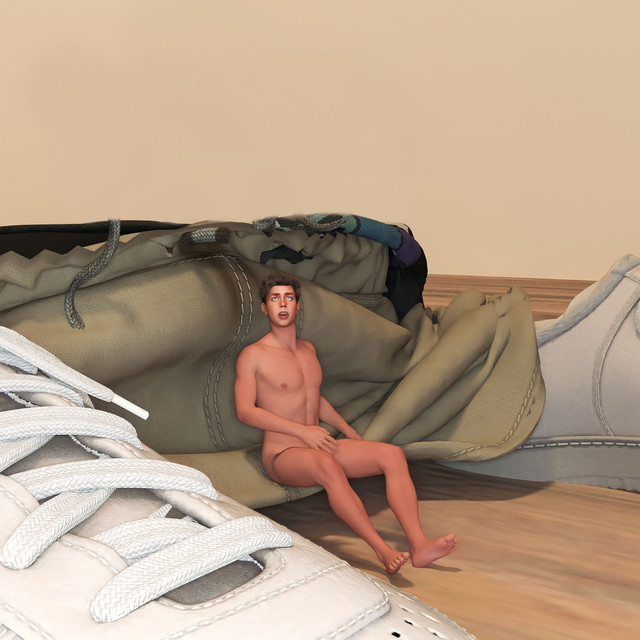 I love the shrinking out of his clothes aspect of your creation, here. Β It really emphasizes the embarrassment and humiliation of suddenly shrinking down such a size, when your first encounter is the physical challenge of crawling out of the enormous pile of abandoned clothing that fit your body just right, only moments before. Β This college stud lost his 'big man on campus" credibility instantly when he went from being a fresh faced, dean's list, 19 year old, 6'2 university athlete in prime shape to being the target of shrinking down to three inches tall, naked, and engulfed by his sneakers, gym shorts & tank top, sport socks, and briefs. Β His briefs and socks, most of all, radiated a suffocating odor, fresh from his body, just after his morning run. Β How could something that had only been covering his round, bubbly glutes, his hips & lower abs, his taint, and his well endowed privates (of which he so proud and demonstrative of), now be the size of a a huge outdoor tent? Β And how could his man parts have produced into his underwear, so strongly overpowering an odor of raw, fresh male essence, straight from the source? Β He stood up on his bare feet, naked and shocked. Β Suddenly the smell of his manhood that was all around him, confronted him instantly with a devastating fact. Β "Oh, gee! Β I'm not even half the size of my own boner, anymore!"