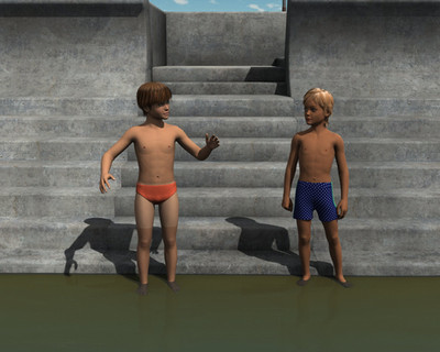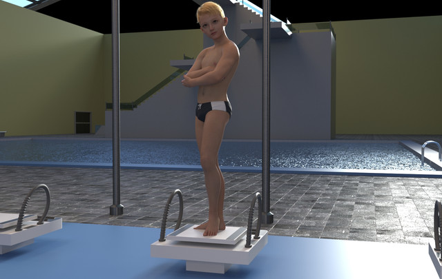 I'm still playing with the UberEnvironment lighting set. Now that the render is finished (argh, it took nearly 8 hours to complete), I think it could benefit from a couple of directional lights coming from above and the side rather than relying just on ambient lights. Also light intensity caused some flaws in the finished image - weird shades on the big kid's skin and face oversaturation. And I didn't even start trying to render realistic water.