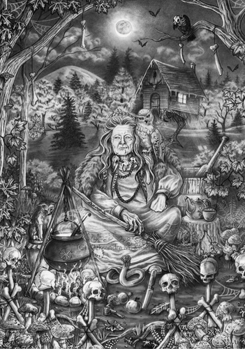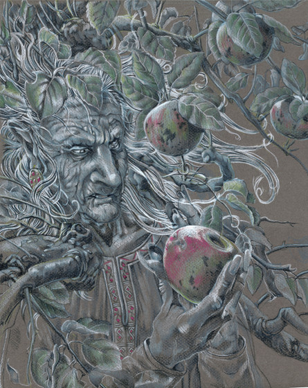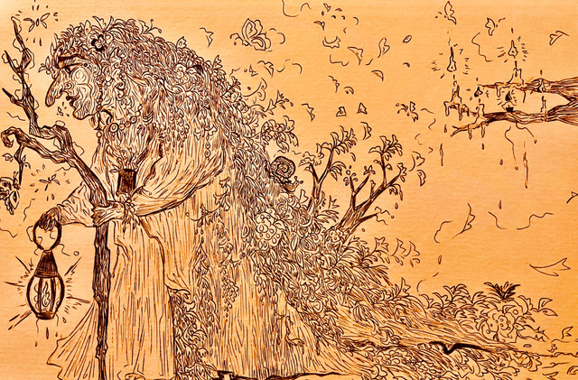 A troll matron sweeps out the trash and debris, her apprentice peaks out to bring a welcoming offering.