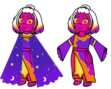 Personality: very similar to stan (from gravity falls)'s "mr. mystery" act, trying to sell her merchandise and generally just like. promote her business and stuff. she's genuinely nice though, overall, and unlike mr. mystery isn't just trying to scam you out of your money. she's very desensitized to stories about gems getting corrupted, not that she doesn't care, but just... she's gotten good at not letting them get to her. she will protect that cape thing with her life, and will hardly ever take it off.