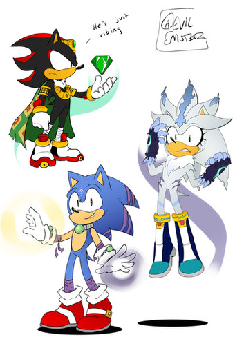 So Sonic is from Kheli in this AU. Kheli is predominantly made up of Caelis (or wind elementals) but Sonic is not a Caeli. Still has his super speed though don't worry. Shadow on the other hand, is not officially from anywhere. Even then though, he frequents Sicilya, so it's practically his 'favourite' place. Close second would be the forests of Rozilla. For Terra reasons. Which is what his element is. He cannot make plants or move rocks, but can tap into Chaos, which is what those Chasma crystals are made up of, which is ridiculously hard to do jsyk.