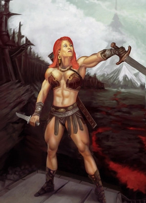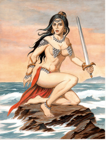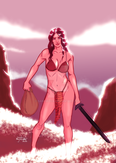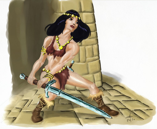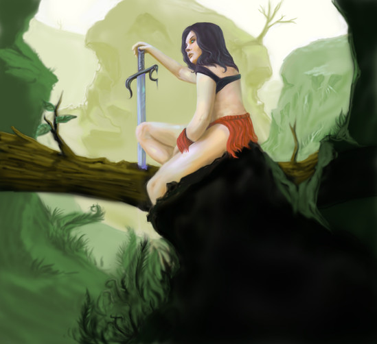 I like the background in this. It really adds to the effect. The woman is great, I really like your style, though to me, her left foot and ankle look a little thick. I would have put a bit more shape around the heel and instep I think. The sword is fantastic. You're really good at getting the look of gemstones and metal.