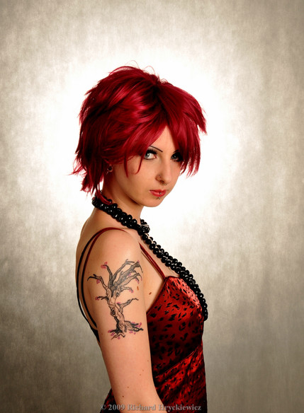 Stunning, especially with the red light behind her head, like a red aura or halo of red. . .
