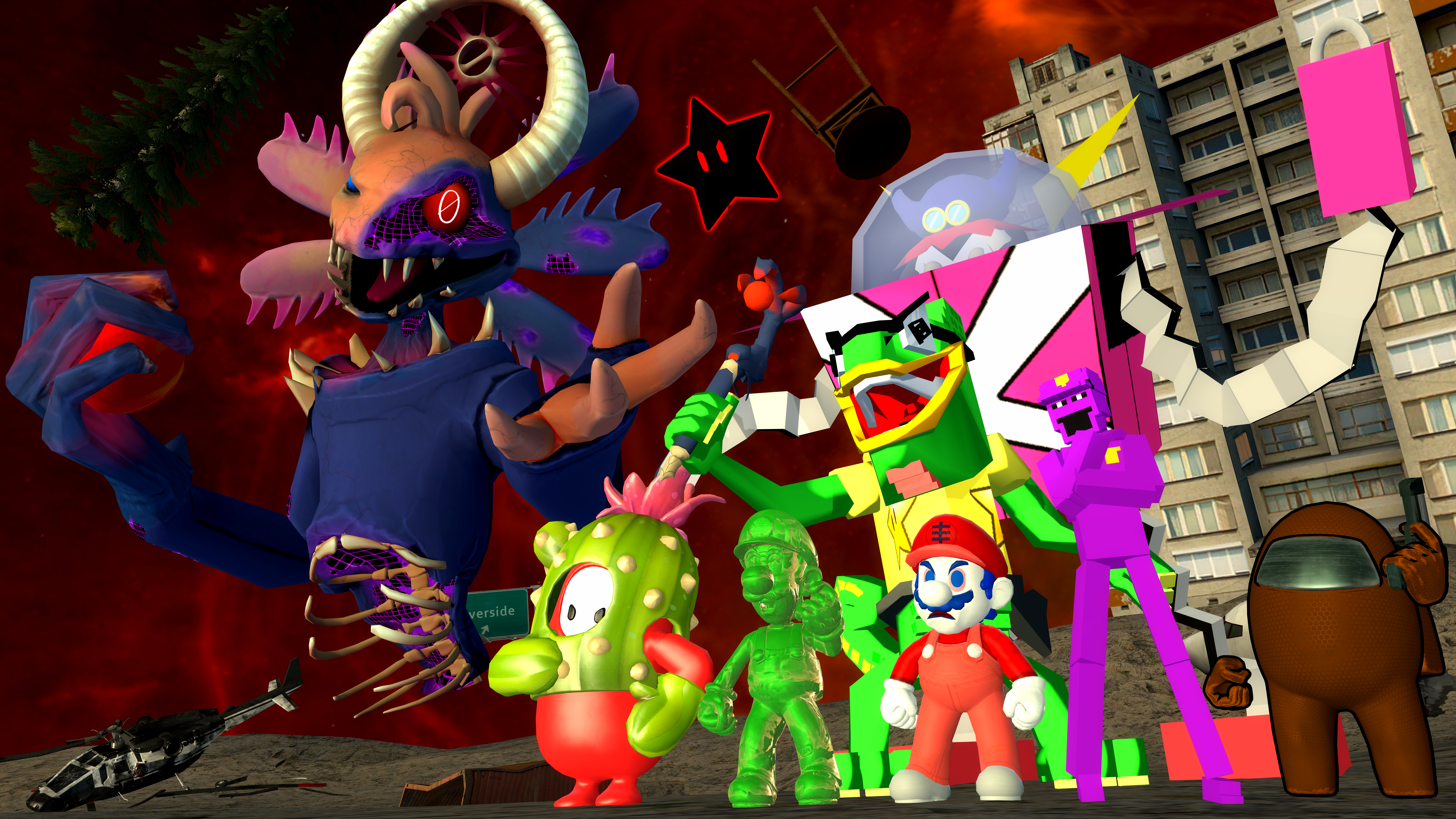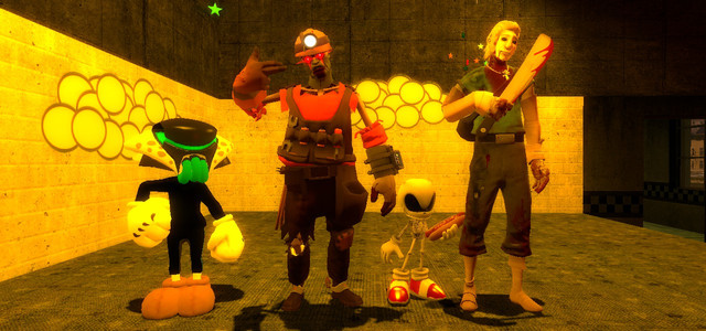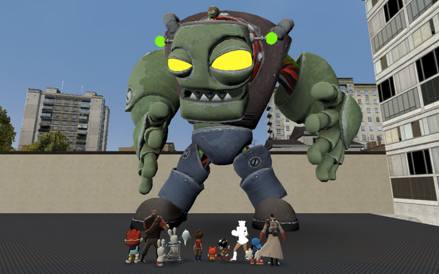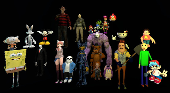 A screen shot that I took in GMod, of a bunch of video game villains who are mad scientists/evil creators, and also Plankton.