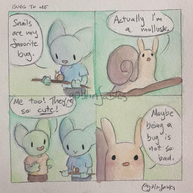 #comic #cute #funny #goblin #goblins #nature #slug #slugs #snail #snails #watercolor #watercolour #fourpanelcomic #goblincore #weirdcore #outside #goblinfables