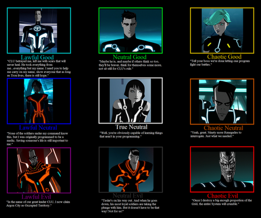 I know, I've already made a PokΓ©mon alignment chart. But, I think they're so damn cool and inspiration struck. So here it is: a Tron themed alignment chart.Feel free to let me know what you think of the choices!