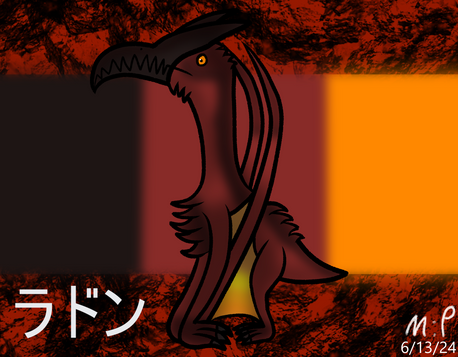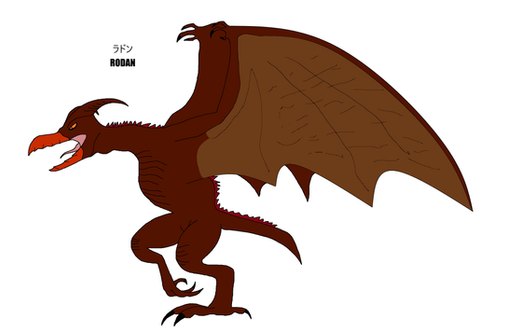 Rodan is a giant golden eagle, mutated by the dumping of nuclear waste, who lives in a volcanic cave in Mexico. He first emerged attacking small villages for material in order to build a nest. Rodan seems to be quite temperamental at times, rarely ever befriending other monsters, though this may be due to his need for a mate.