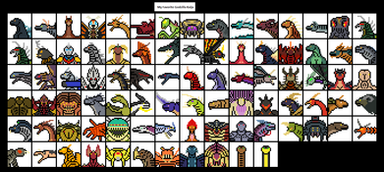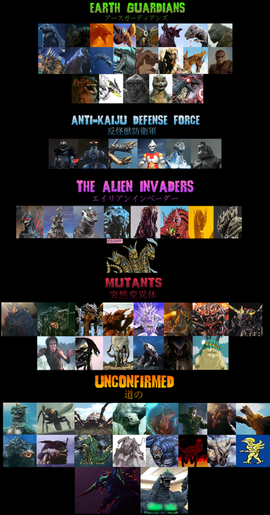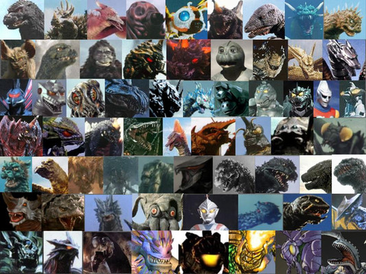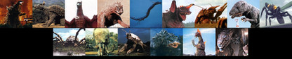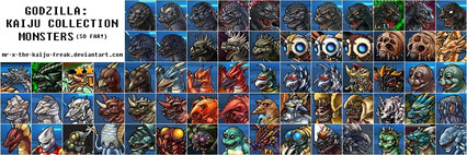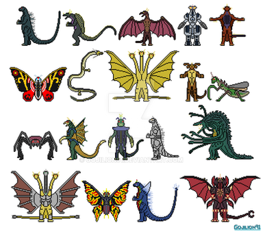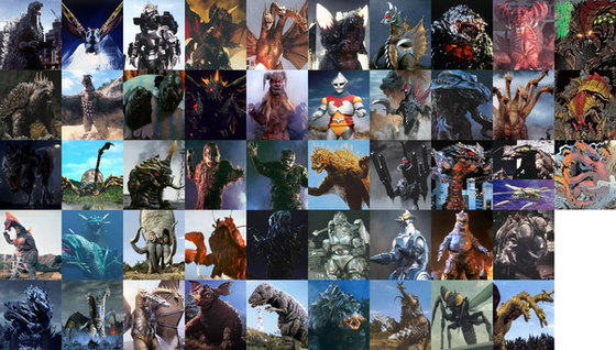 Godzilla, Anguirus, Rodan, Mothra, King Ghidorah, Ebirah, Kamacuras, Kumonga, Gorosaurus, Manda, Baragon, Varan, Kamoebas, Hedorah, Gigan, Megalon, Jet Jaguar, Mechagodzilla, King Caesar, Titanosaurus, Biollante, Mecha-King Ghidorah, Battra, Fire Rodan, SpaceGodzilla, Moguera, Destoroyah, Godzilla Junior, Dagarla, Zilla, Orga, Megaguirus, Kiryu, Monster X, Keizer Ghidorah, MUTO, Servum, Redmoon, Erabus, Mogu, Deutalios, Bagan, Gigamoth, Gryphon, Barubaroi, Uchujin (M), Deathla, Vishnu, Rokmutul, Pterodactyl, Balkzardan, Jyarumu, Shiigan, Vagnosaurus, Krystalak, Obsidius, Glacies, Firebird, Eartheater, Chimera, Axor, Power Dragon, Crustaceous Rex, Nanotech Creature, El Gusano, Cryptocleidus, Crackler, Quetzalcoatl, King Cobra, Robo-Yeti, Cyber-Zilla, Chameleon, Ts-eh-Go, Komodithrax, Gandora, Inagos, Soran, Cybersaur, Bagorah, All-Terraintula, Burtannus, Lord Howe Monster, Shinomura, Trilopod, Rattler, Yellowback, Futami, Tezuka and Amphibion.