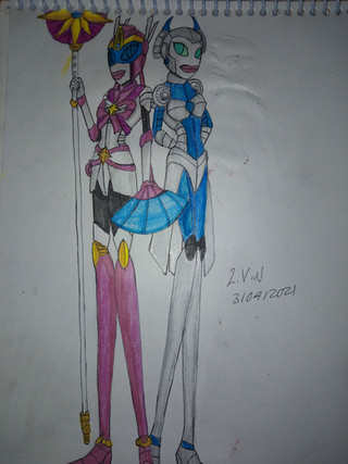 I can see one reason why you did it, though: if she weren't dark-skinned, you wouldn't be able to see her as the glare from her power suit can be felt from miles away. The helmet is the true winner of said morphed form here, but otherwise, everything appears uniform with the other... erm... uniforms. ^^