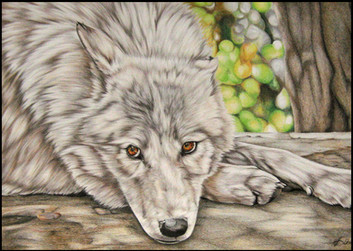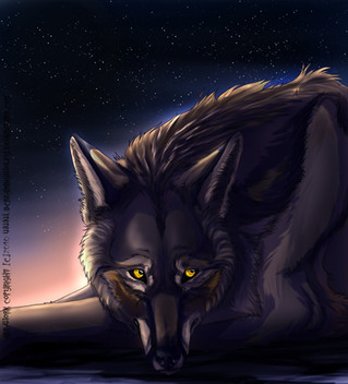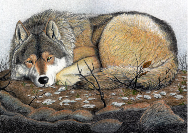 My favourite part of this images is his expression, as if he's just been disturbed but isn't sure if he wants to move. The colour of the eyes is beautiful. I agree that he does kind of look a bit like a mix of coyote and wolf. For some reason I always imagine wolves being somewhat shaggier though I know that's not true. XD I am always impressed by your art. I would offer my crits on this if I had any. Take care.