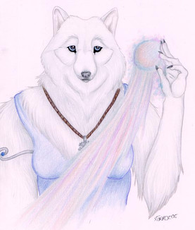Combining the elements of the feminine mysteries: Moon, magic, and foxish cunning.5.25" X 8.75" watercolor, colored pencil, acrylic paint, and Swarovski crystal accents on Bristol. 2008.