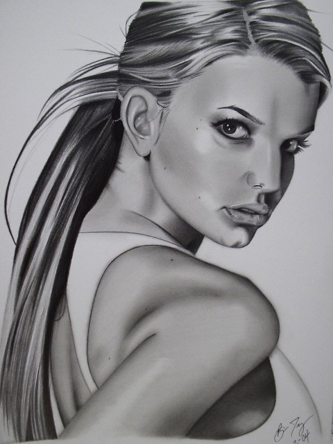 Amazing drawing! The lighting gives it such a photographic quality - I can't get over how real she looks. You were able to draw the effect of making her face more in focus than her shoulders so well. I think this helps the drawing look so much like a photo. I can tell that you followed the reference perfectly...she's very beautiful. I can't see a single pencil mark! Her eyes and hair are especially realistic. I wish I could say something more constructive, but I love this!