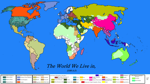 A cover of someone else's work again (gah-I really need to come up with my own mapamatical ideas). [link]The current year is 2070. In the 2020s, a global event called 'The Flood' occurred. Vast areas of the world were covered in ocean waters, and wars raged. Russia collapsed, the People's Republic of China was overthrown. America absorbed the failing states of Mexico and Canada.