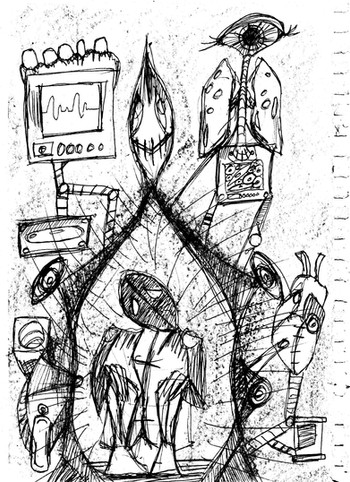 - Drawn with pencils and markers; scanned and color-manipulated with Gimp.