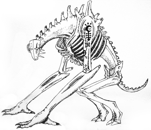 One of the more successful lines of genetically-engineered war beasts, the "Reaver" series is designed to be maneuverable through many environments, midly resistant to firearms, and intelligent enough to follow orders. A genetic flaw causes them to be "born" without the upper layer of their skulls, but soon after production they're fitted with a special helmet that includes a visor, scent receptors, audio sensors, a breathing device, and a CPU that feeds programmed orders directly into their brainIn battle Reavers are known for their characteristic metallic cry and vicious relentlessness in combat. They will climb, leap or tear their way through obstacles to reach marked prey, twirling their bodies to slash elongated scythe-claws with deadly precision. Their ridged jaws are even strong enough to break holes in metal.