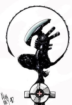 This is actually quite old, but I was inspired by a recent fav to put up my own ALIENS fan art. ALIENS, by far, is my favorite movie of ALL TIME. it is the origin of my profound obsession with science fiction, I mean it has to be! C'mon, you can't lose with directors like Ridley motherfucking Scott and James Holyshit Cameron (We will erase from our memories the names of the directors from 3 and Resurrection, God help their damned souls). I am also an avid fan of the comics... because they are created with freelance artists and writers, it's a real rarity for quality to apply to both of these factors, but when two talented people do team up (Labyrinth, Music of the Spears and AvP to name a few, if you know what I'm talking about) the outcome is awesome.So... yeah. This is a picture of my interpretation of a xenomorph. Mine are a bit more lithe and spindlier than the ones in the movies, but really it's just a concoction of all my favorite ALIENS interpretations from the movies and comics rolled into one. I really want to work on an ALIENS comic, but I think it's illegal if I'm not doing it for DarkHorse...