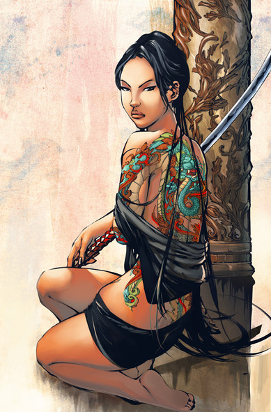 I also think the coloring is great, but the girl with the weapons is extremely cool, too.