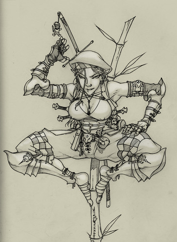 This is a very late, late art-trade I did with . I did his character, Lian (Japanese/Chinese lethal babe, check out his gallery to see the original character) and he did my ever-present character, little Rosie-Annie (And a great job at that... check it at his gallery! plugplugplugplug). I tried to combine Japanese weapons with a more Chinese color scheme/clothes, if that makes any sense... Although it was hard to balance it out, because she has so many weapons and so few clothes. I think we arranged to do this about 2 months ago, but I kept getting distracted with school projects and stuff. Sorry dude, but at least it's done now!EDIT: Saw the leg issue immediately after reading your posts and changed it. Surely, computers are the tool of the picky artist. Thanks for the feedback!