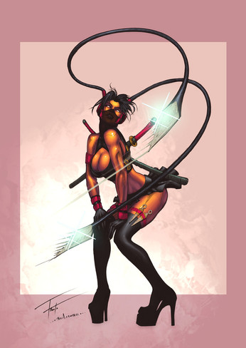 Wow, that's pretty damn cool. heheh, so many weapons and so few clothes *chuckle* She still looks very kickass I'm admiring your colouring style here: it's accurate and lively and it's polished, but at the same time, it's got this funky laid back texture to it. Luv her socks lmao