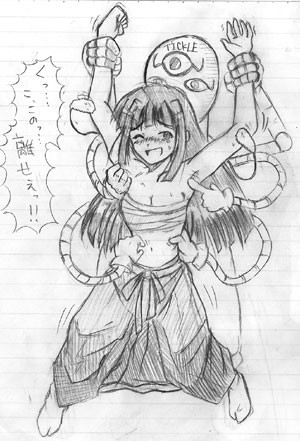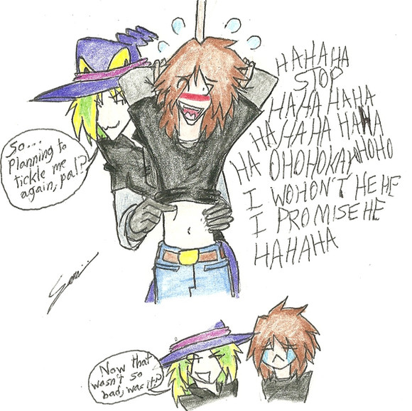 I really LOVE this character and both pics you've done with him!!!! Awesome job with colors, composition and expressions.....I especially love how you depict him smiling so close to her face, as if he is wanting to see her frantic tears as close as possible....and WOW! that certainly does look like it would tickle unbearably!!!!! He definitly has found a way to secure her attention! LOL!Β