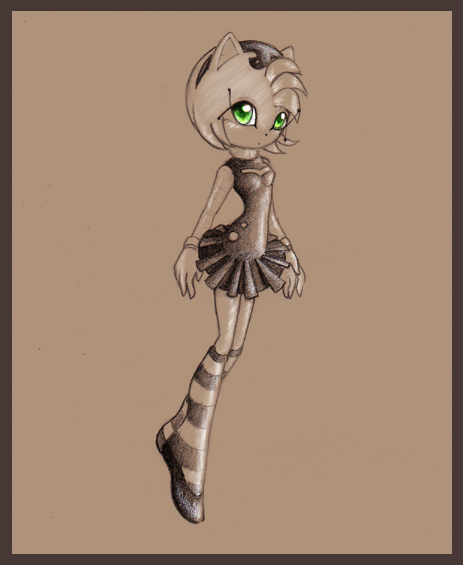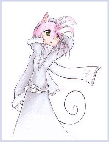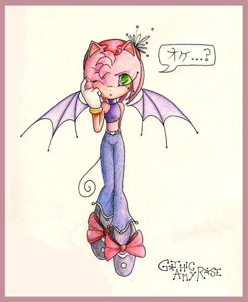 She's supposed to be sitting on something, a ledge perhaps, but my scanner didn't pick up the shading so well.The dress is nearly the same as Amy's, but with a few things added on. I like Rouge, because I like bats. I'll have to do some more pictures of her.