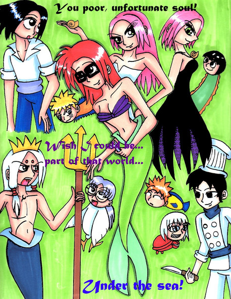Fantasmic! is my favorite show at Walt Disney World. Why? It's a huge villain crossover, and that makes me happy.So, because the show is a crossover, I thought it would be fun to put Rin as Kairi here, because Kingdom Hearts is more or less another big Disney crossover. The extra villains in the background are villains who appear in the show, but now I feel kinda bad that I didn't use 101 Dalmatians. Poor Cruella got kicked out of the pic. o_o Oh well! The other villains pictured here are (top row) Sasuke as Scar, Orochimaru as Jafar, Hidan as Hades, (bottom row) Pein as Frollo, Sakura as Ursula, Asuma as Governor Ratcliffe, and Tsunade as Maleficent. They're all working for Madara as Xemnas!