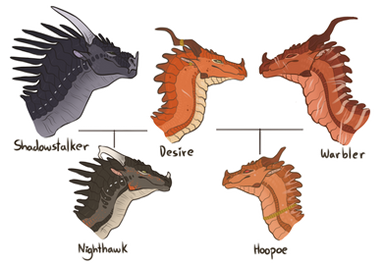 PAIN (Hoopoe) - Hoopoe is Nighthawk's younger half-sister, a full Skywing as Desire went on to find a new husband, Warbler, a Skywing palace guard. Nighthawk lived with his mother and his step-father and half-sister although he despised them (except for his sister), missing his real father. Because of this he left to the Rainforest Kingdom with the Skywing Queen's permission, her hoping that Nighthawk would somewhat help Sky/Nightwing relations as he essentially was the product of two dragons (both from different tribes) of very high authority, his existence essentially reinforcing Sky/Nightwing relations up until Desire leaving Shadowstalker. However, after meeting his father for a bit he started to feel bad for Hoopoe, missing her even, especially since they were rather close even when Nighthawk was a dick to her.