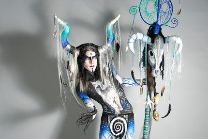 Baphomet ? And isn't the number 53 significant to freemasonry or something ? Β Some angle of some symbol or pyramid, I can't remember. Anyway, this is impressive, I love the body paint. The horns remind me of Maleficent lol.
