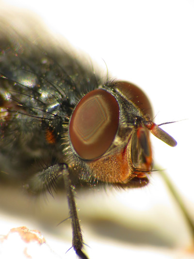 This is one of the coolest photos I've seen in ages. I mean, macro photography has always been impressive when properly executed, but the detail in this really blows me away. And, intentional or no, the blur adds a nice diffusive contrast to the more focused head of the fly (which is the important part, anyways )