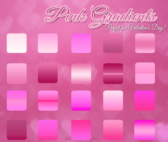 63 reddish-pinkish gradients, with some more red, some more pink, and some similar to others. There is a .grd file as well as 63 100x100 images of the gradients. ((Which was a gigantic pain in the butt to save. x_x))Enjoy!