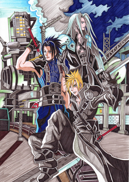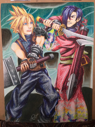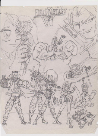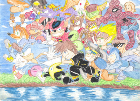 Drew this for a friend's birthday, 's in fact... it's only about a month late!Based it off the Kingdom Hearts box image with characters he's a fan of replacing similar characters from the original image, I rather do like this drawing.
