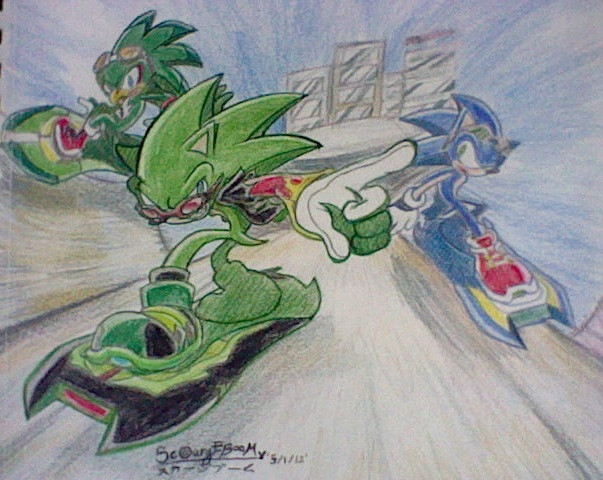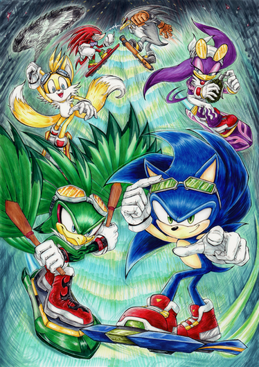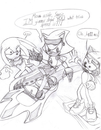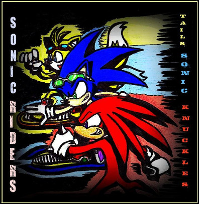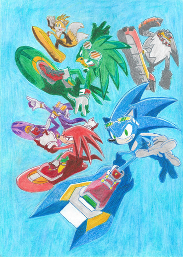 Fanart of Sonic riders. From the opening movie of said game but in a more traditional Sonic style.The game looks great and concept is awesome. Too bad the boards have all the agility of a drunk elephant and I found it imposible to get past the third level