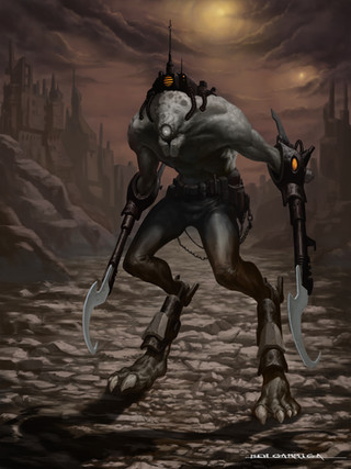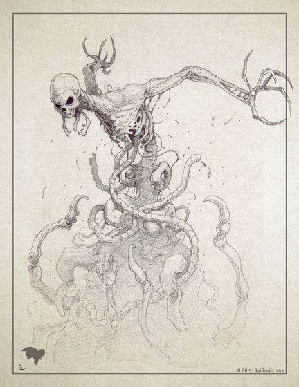 Negative space is definitely working for you here, Ben. Compositionally, this is a great looking piece. In photography, they talk about the rule of thirds, where, instead of having everything centered, you have the components offset at the horizontal and vertical 1/3 and 2/3 marks. That's what you've done here basically. The viewer's eye is drawn from the open mouth down the upper torso (NOT the right arm, even though there's a visual fork in the road) because it's the thicker and more detailed aspect of the body and then back up to the left hand. I think, if you had kept the body straight up and down, that you might have lost the hand. The addition of the right hand further down in the ooze pool is a nice addition, though it comes in as a secondary component which could have been omitted and still maintained the mood of the piece.