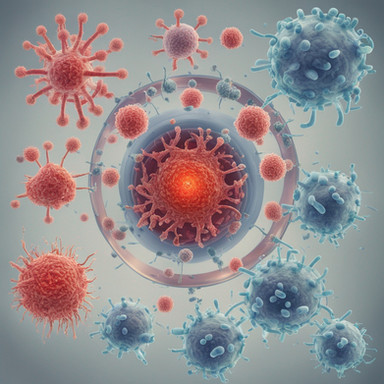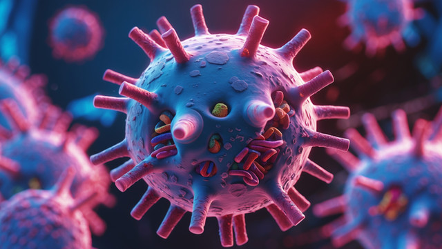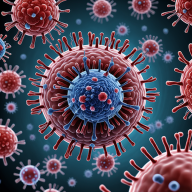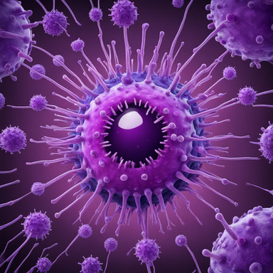 This is a 3d visualization of the coronavirus virion on a surface with cells at a distance.You can find more images for sale here:
