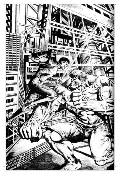 In a blur of green, Hulk retaliates, surprising Doomsday from the mushroom cloud of dust and dirt. Powered by his anger, Hulk smashes both palms on either side of Doomsday’s head. Shards of bone chip away as Doomsday shakes off the concussion and grabs his adversary. They wrestle to the ground, simulating an earthquake.