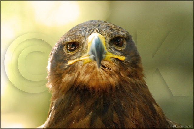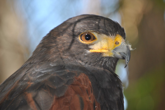 My wife and I spent a very interesting day in the company of a falconer. In this photo the pink colour is being reflected from her shirt (which can be seen reflected in the eye too).This is a trained Harris Hawk. There were in fact two of them and they were very much 'with' us. They followed us around the wood somewhat like being accompanied by dogs.