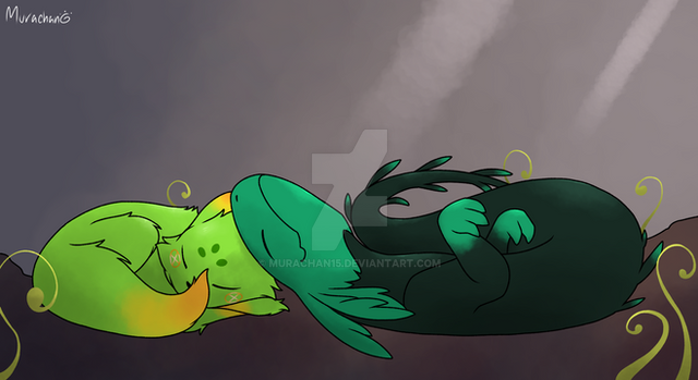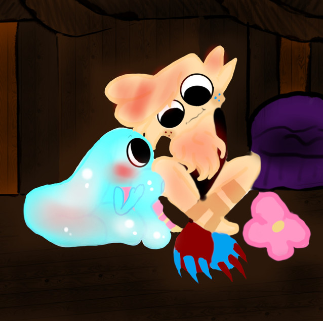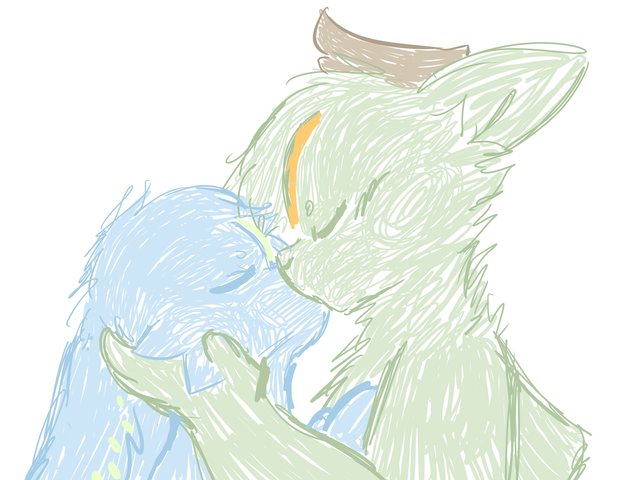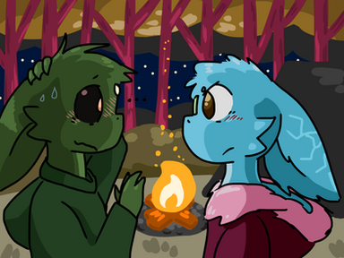 To end the day, Riggie and Ripple went and picked up Kai, and took him to their new home. Their fondness for him was both equally as parent-like, even though Riggie wasn't Kai's real father. He was there when the seed was laid and has been ever since. They showed the excited but nervous little boy around, then together, put him to bed in his new room. Then Riggie and Ripple went to go put sheets on their bed and curl up for the night. They were used to sharing a bed, even a year before dating. Living conditions weren't ideal back then. But now, it was a little bit different. Riggie was excited to finally be able to hold her. And he was excited about being excited. While she was putting on her pajamas, he sprawled out over the bed and spread his arms out wide with a big smile. It took her a second to see him, but when she did she wasn't exactly sure how to react. It made her happy, but also awkward. So she awkwardly crawled into his arms on top of him. She looked at him very nervously... the mood was changing. Now he was soft and gentle. He set his head towards her kind of slowly, so she went to kiss him...