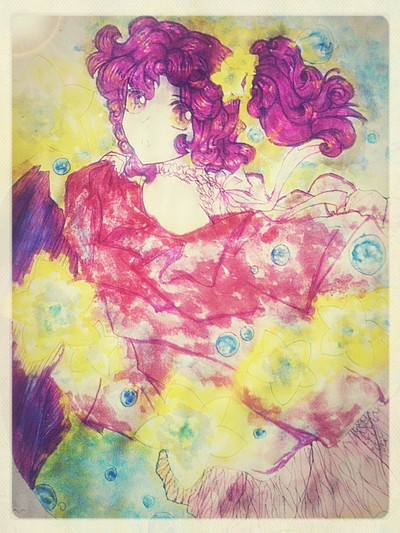 Copics, Prismacolor, coloured pencils, white gel pen and white paint.