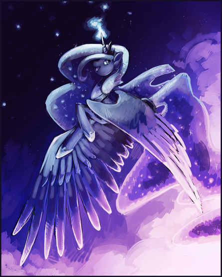 Lovely work on the best princess as she basks in the glory of the heavens so smoothly, peacefully. It's easy to picture her here melding easily into ponies' dreams and bringing with her a sense of wonder and joy. Fantastic work on the lighting and shading to give her form so much depth and create such a magical mood all around.