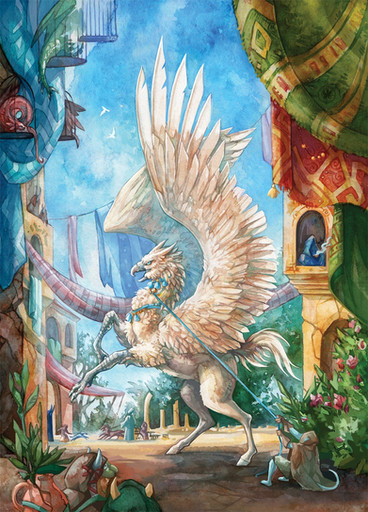 It's a beautiful and happy scene as they enter the city and the young girl happily checks out the surroundings. For her it must be rather exciting, even though her weary father clearly finds this to be old hat by now. The two plus their charming beast make quite a lovely trio. Beautiful work on the "neo-mythical" creature carrying all of the man's most-important things. It's quite an intriguing design, beautifully executed and adorned so cutely with the collar, headband, blanket, bags, etc. Nice work on the hot and hazy view of the town's basics as they make their way to the markets too.
