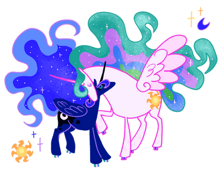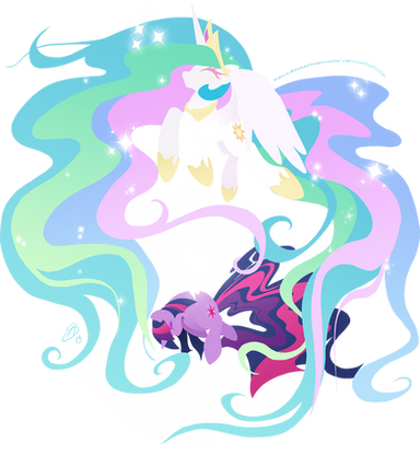 The first night that Luna came back to her sister. Still emotionally shocked, her emotions kept her awoken and stayed up all night to watch over her little sister while she was sleeping, even after setting the sun and raising the moon. "She's here, she's here!" she kept telling to herself. Right in front of her eyes... Her sister.... finally after a thousand years.... a thousand years of regrets, of tears... of heart wrenching lullabies... Little was known that those who witnessed their princess of the sun's lullabies to her lunar sister over that period, mostly on full moons nights. Few ponies watched her doing, but few couldn't bear watching and listening to any of them, for the sorrow was too deep as much as for watching her princess in this state than to watch her singing to the worst enemy Equestria faced that their ruler defeated herself. No, few understood, because nopony was there at that historic moment when Celestia banished her own beloved sister to the night's celestial body, but mostly importantly.... who else ever banished their own loving sibling for the sake of their land and subjects? They only quietly watched and cried and left her to herself with her chagrin.